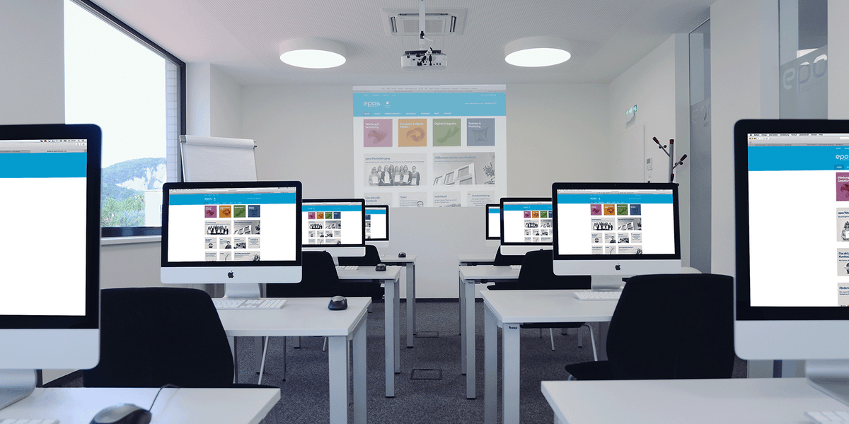 Leistungsstarke Macs, augenschonende Monitore, komfortable Stühle, Smartboards, didaktisches Netzwerk, Beamer, Mind-Mapping-Material und vieles mehr sorgt für abwechslungsreiche Schulungen.